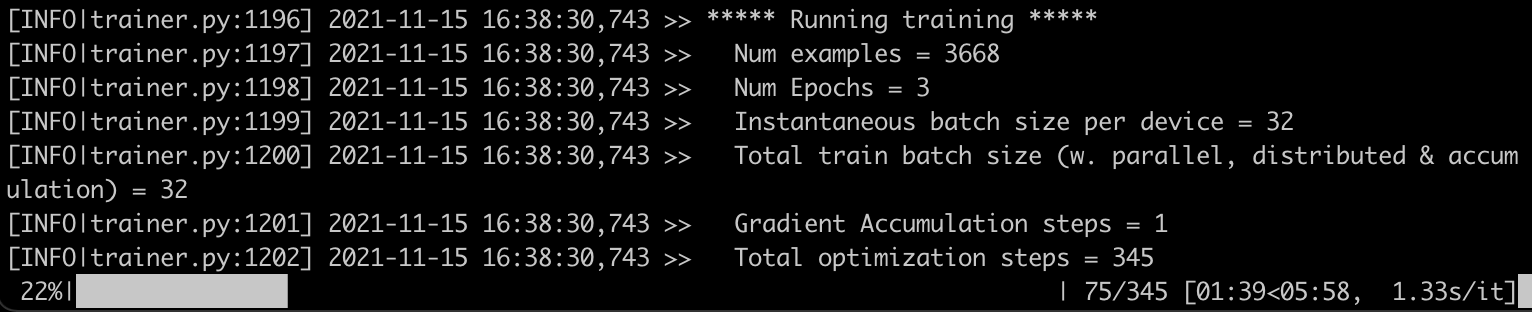 To get a baseline, let's launch a single-node job running the run_glue.py script in transformers/examples/pytorch/text-classification. This should work on any of the instances, and it's a good sanity check before proceeding to distributed training.